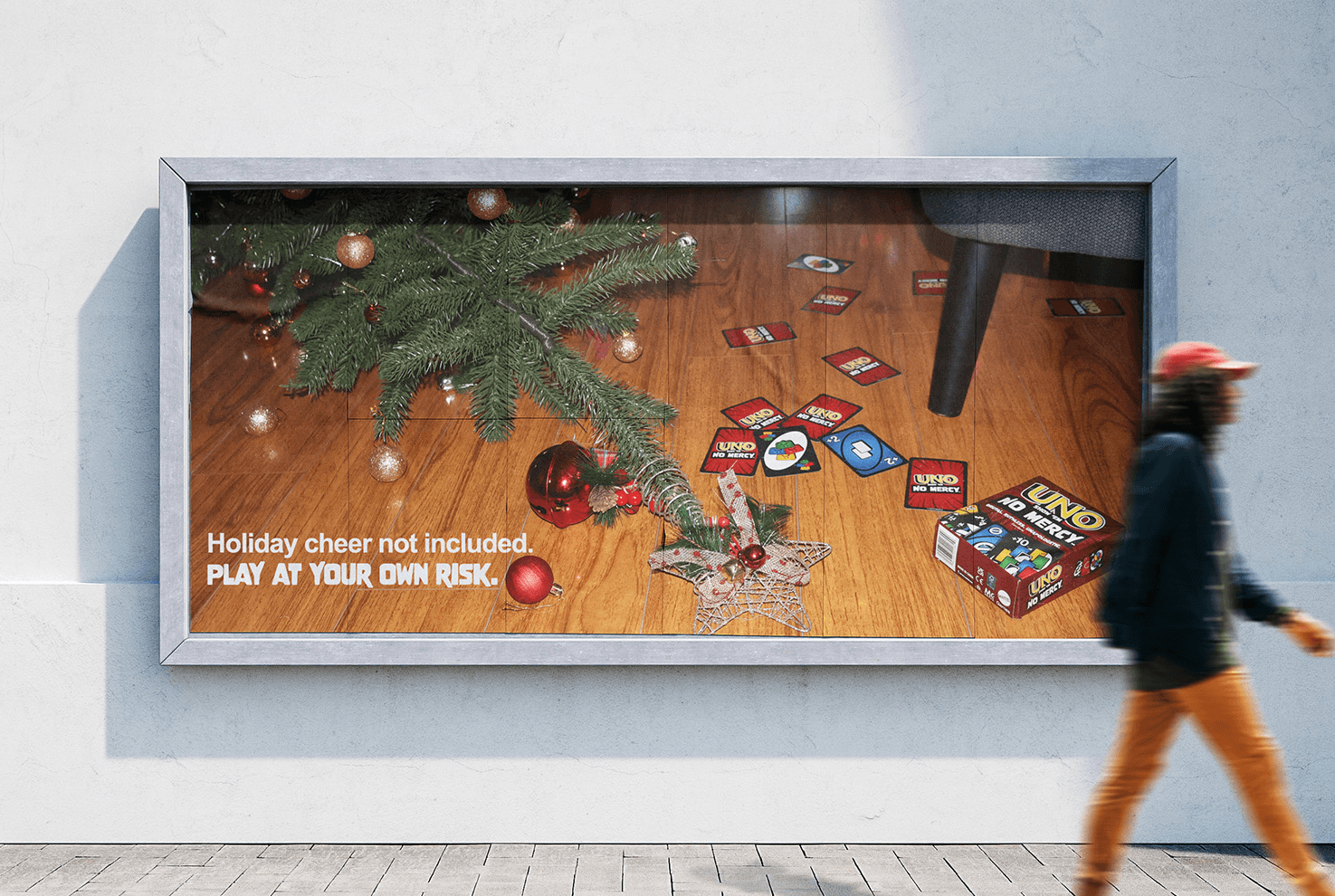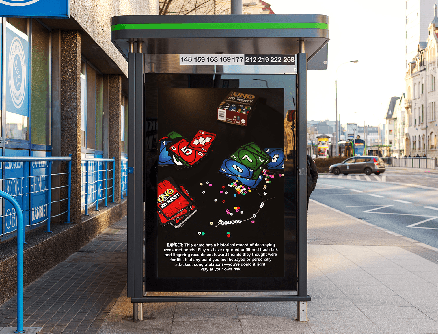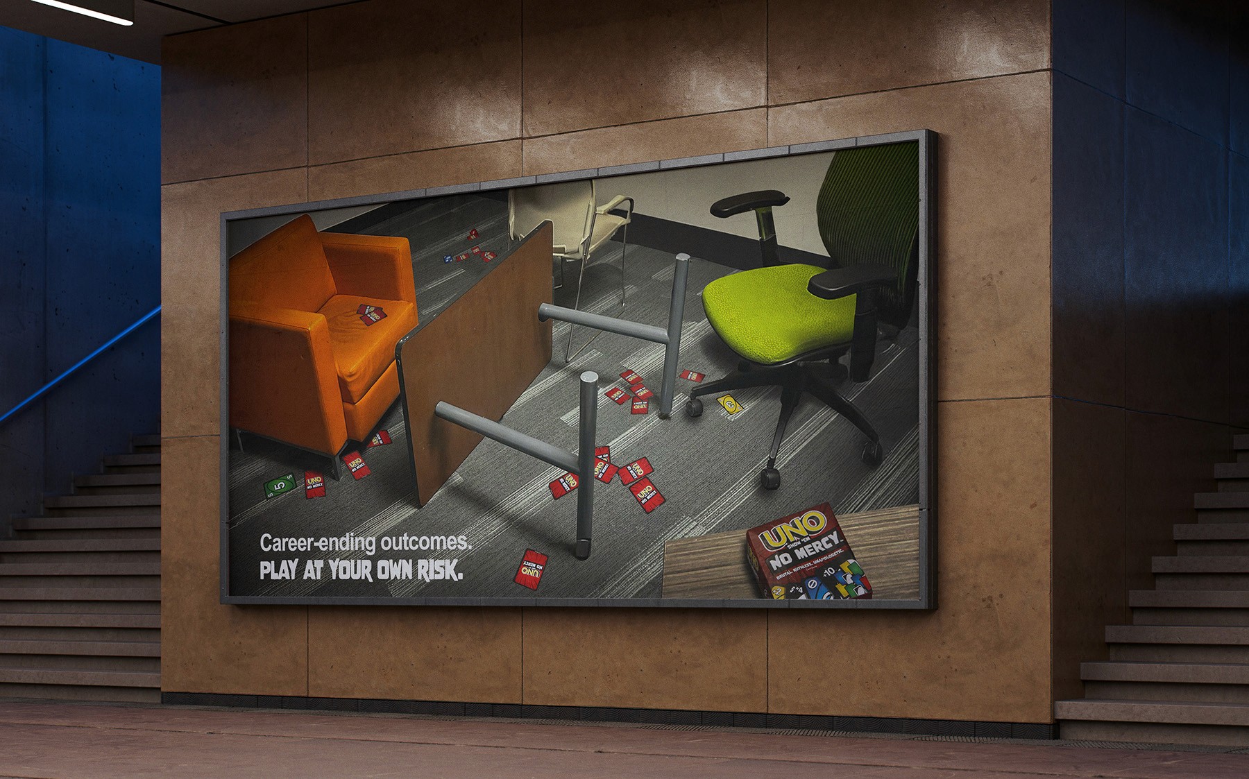 Calling all UNO lovers—your favourite childhood game is back, revamped, and more ruthless than ever. This campaign is a glimpse into the catastrophic aftermath of an UNO Show ‘Em No Mercy game and a friendly warning to play at your own risk…